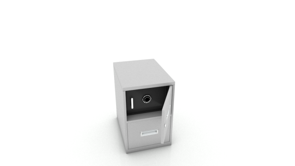 Archivero metálico vertical, gavetas tamaño oficio y caja fuerte con marco inferior de tubular y resbalón metálico, para soportar peso, corredera de extensión móvil, jaladera de aluminio y doble cerradura para puerta y cajones. *Caja fuerte intercambiable americana