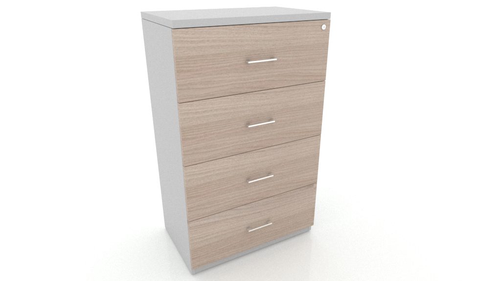 Archivero horizontal, gavetas tamaño oficio, cuerpo metálico con frentes en melamina, corredera de extensión movil, nivelador de altura, jaladera satinada y cerradura.