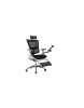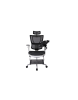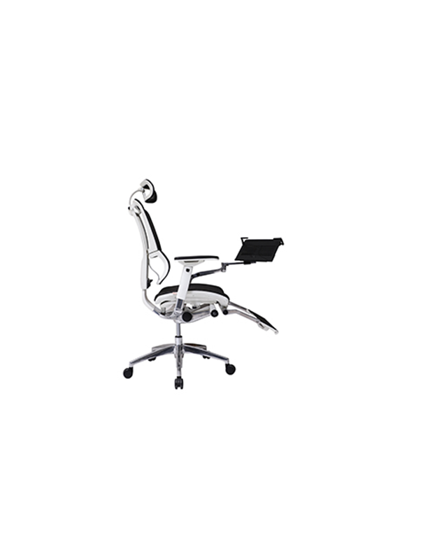 Asiento y respaldo en malla con soporte lumbar flotante integrado, con posa pies y porta lap top retractiles.