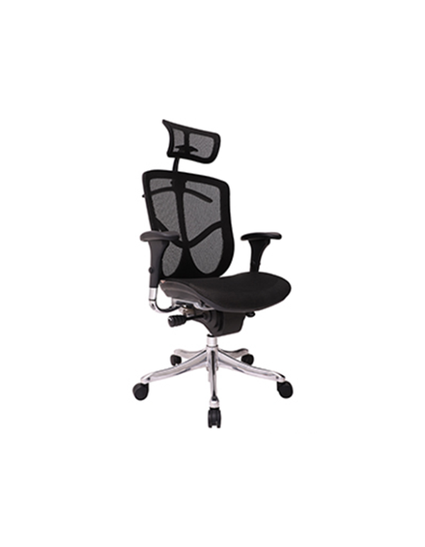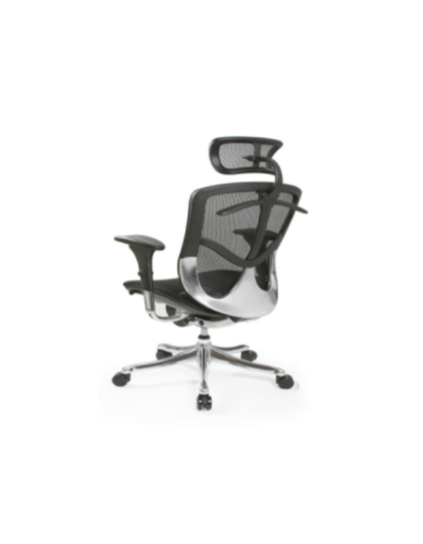 Respaldo en malla en polímero termoplástico con diseño ergonómico y con concha de aluminio en laparte posterior y perchero integrado.