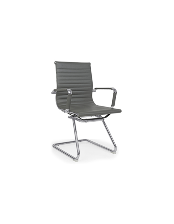 Sillón VISITANTE con base de trineo, tapizado en PU con asiento y respaldo GRIS con marco y brazos en acero cromado.