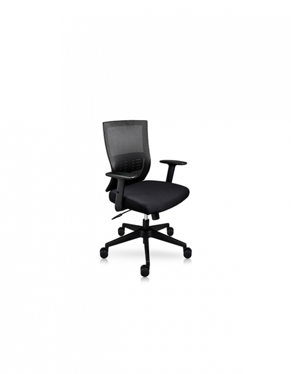 Sillón Semi-Ejecutivo, respaldo en estructura de polipropileno con fibra de vidrio tapizado en malla y con soporte lumbar ajustable en altura, asiento con espuma estándar tapizado en tela, base de nylon de 26″ con rodajas de nylon, mecanismo ejecutivo con palanca para activar pistón y bloqueo de reclinamiento. brazos fijos de polipropileno en forma de T sujetos al asiento, malla y tela de alta calidad de resistencia a la tracción y espuma de asiento con espesor de 7.5cm.