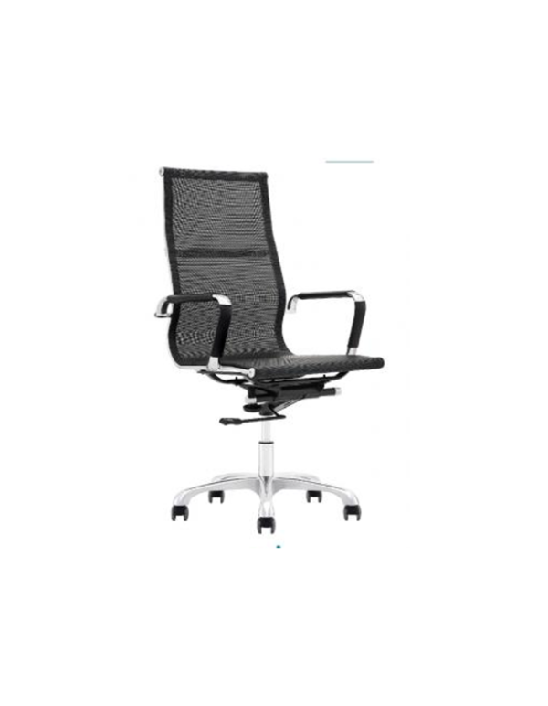 Respaldo y asiento tapizado en malla Flex en color negro, estructura en marco y brazos de acero con grosor de 1.5cms., brazos con funda en vinil color negro, mecanismo de rodilla con sistema reclinable y de bloqueo, pistón ejecutivo, base de 26” en aluminio pulido, con rodajas tipo yoyo en nylon color negro, soporta peso de 150kgs.