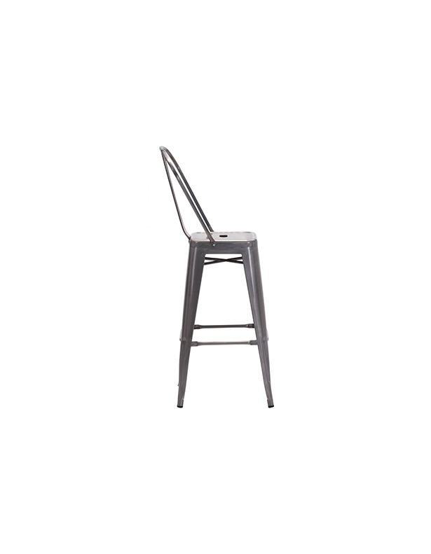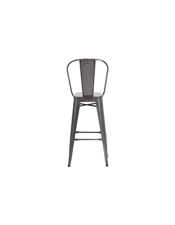 Impresionante silla de bar Elio de estilo industrial con acabado de bronce. La pierna cuenta con puntales cruzados para facilitar el descanso del pie. El marco delgado apoya la espalda y facilita el manejo.