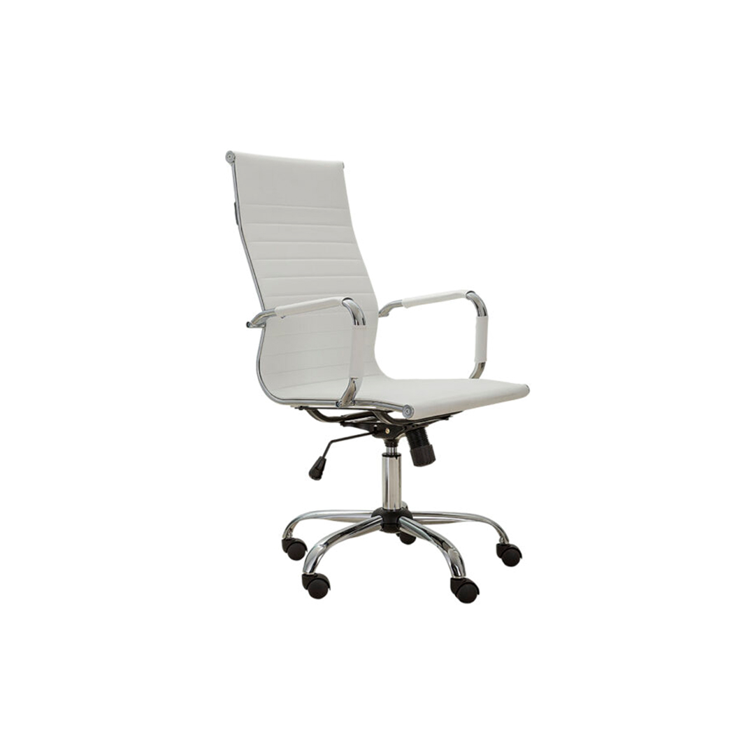 Marco de asiento y respaldo en tubular de acero planchado de 1” cal. 18, doblado en forma ergonómica, travesaños para fijar herraje en tubo planchado de 1” cal. 18 pintado, maneral en la parte posterior para mover el sillón en tubular 1” cal. 18, respaldo y asiento con tapiz en una sola pieza tensada, en vinil color negro y blanco, hule espuma en densidad 17 kgs/m³ de 3 cms. de espesor, brazos en tubular de acero elíptico de 1¼” cal. 18, cromados, pistón ejecutivo, con cubierta telescópica, base cromada de 26” de 5 puntas, mecanismo ejecutivo, sistema reclinable, mecanismo de bloqueo y ajuste neumático de altura.