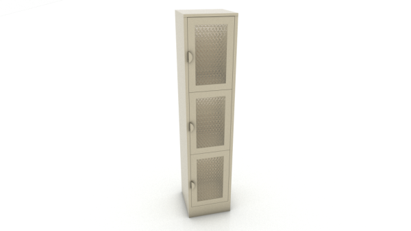 Locker metálico en lamina de acero rolado frío y puertas con malla tramada, jaladera de lamina media luna con porta candado.