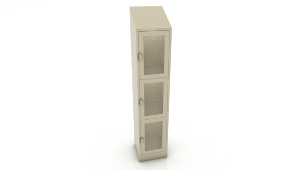 Locker metálico en lamina de acero rolado frío y puertas con malla tramada, jaladera de lamina media luna con porta candado y copete superior.