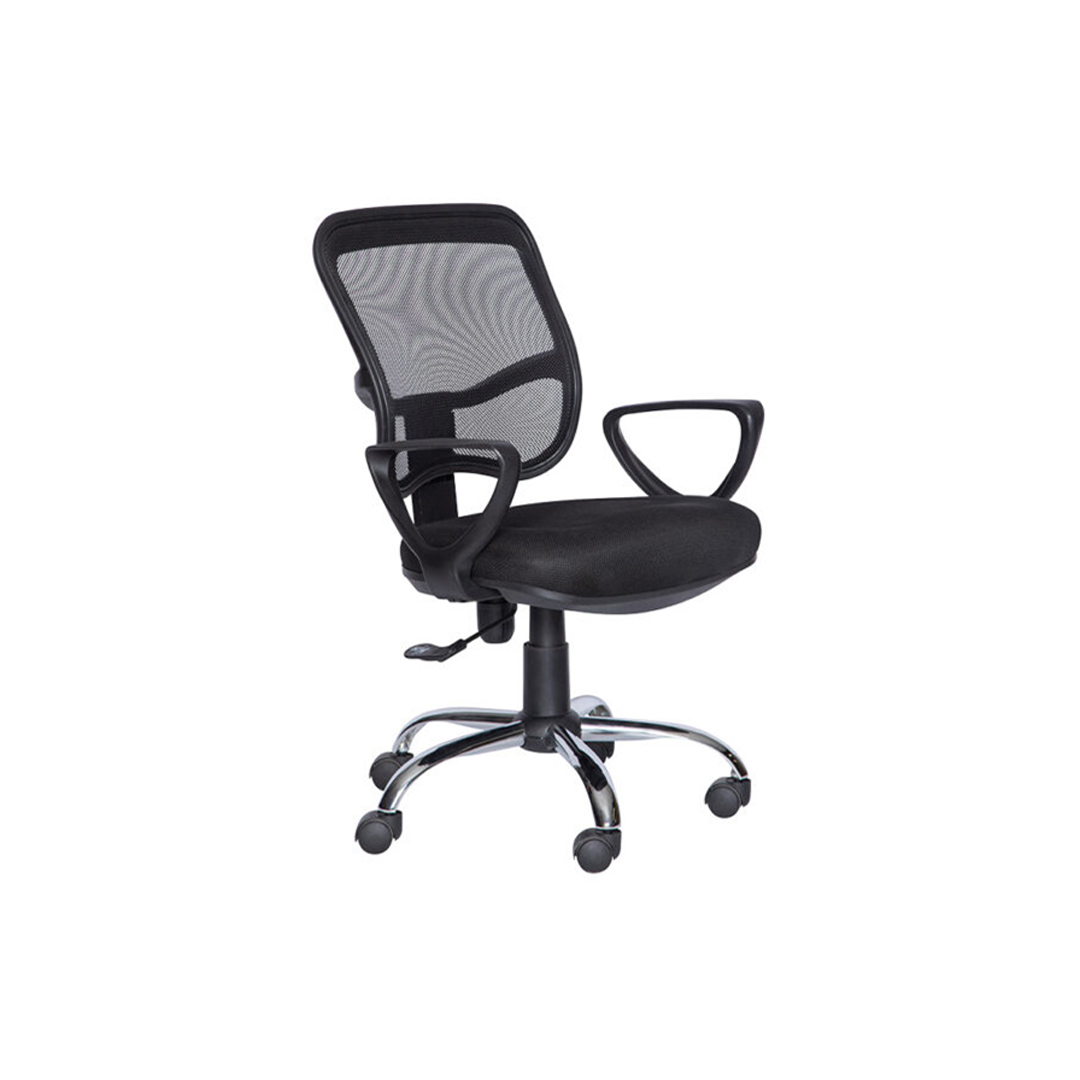 Respaldo de estructura plástica tapizada en malla únicamente en color negro, asiento de aglomerado de 12 mm tapizado en variedad de colores (consultar catalogo tapices), con tapa de polipropileno, hule espuma en asiento 5 cms. de espesor d.30 Kgs/m³, pistón secretarial, con cubierta telescópica, base cromada de 26″ de 5 puntas, brazos fijos de polietileno rígido, mecanismo secretarial, ajuste neumático de altura.