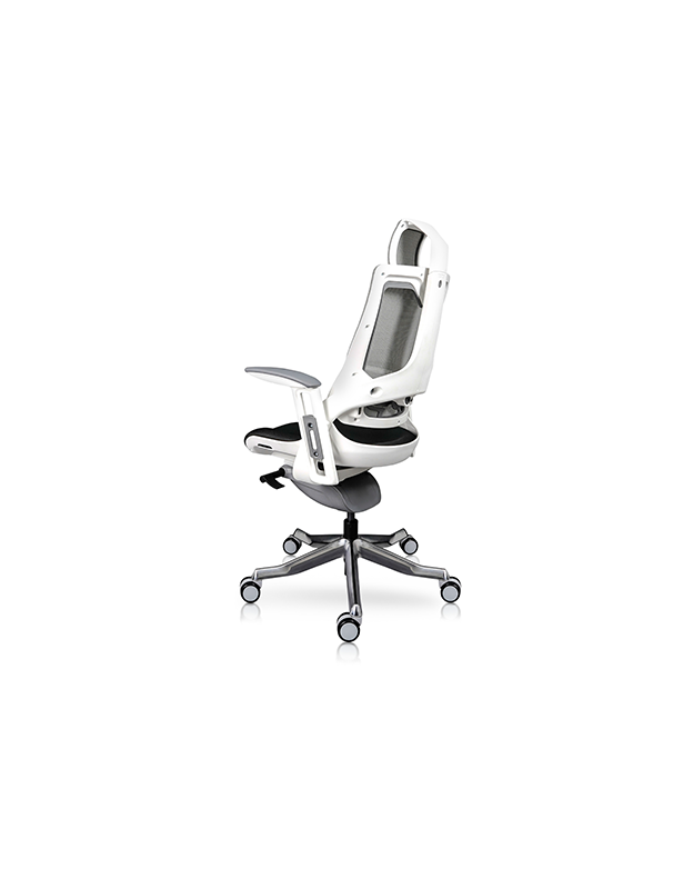 Estructura blanca, cabecera tapizada en tela con ajuste de altura. Respaldo tapizado en malla con soporte lumbar ajustable en altura y profundidad. Asiento tapizado en tela, con espuma de poliuretano inyectado 480 mm de espesor.