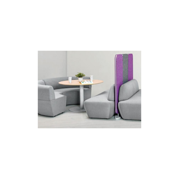 Sofá modular, con accesorio de conexión para carga de celular vía USB. En el fondo de la imagen tenemos paneles acústicos modulares.