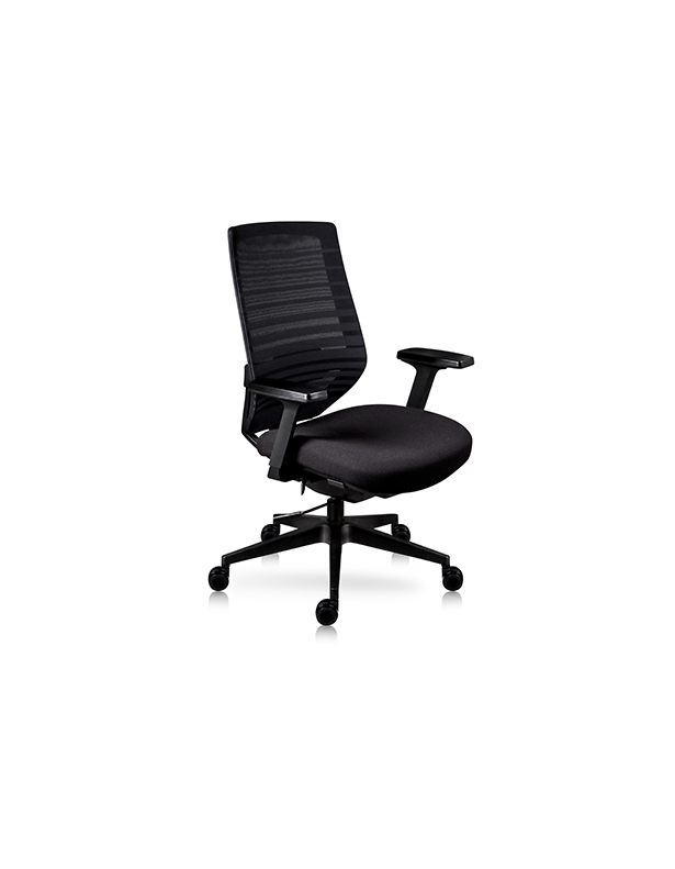 Respaldo tapizado con malla de tela tipo mesh, con detalles en líneas horizontales. Brazos de polipropileno en forma de T, con ajuste en 3 pocisiones (altura, costados y frente). Asiento tapizado en tela, con espuma de 6cms x 27Kgs/m3. Pistón neumático rebasador de base.