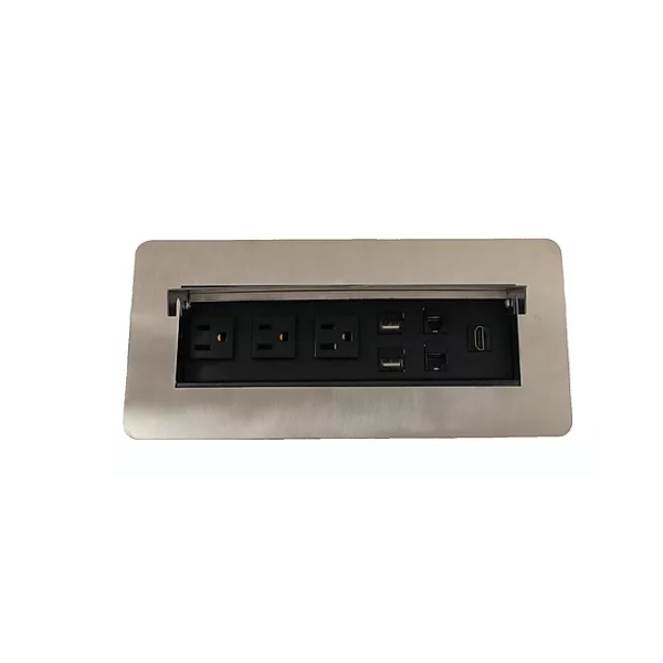 Multipuerto de acero inoxidable, 3 contactos eléctricos, 2 puertos USB para datos y 2 puertos RJ45 (cat 6). Ideal para tableros de 12 a 45 mm de espesor. Pintura Electrostática.