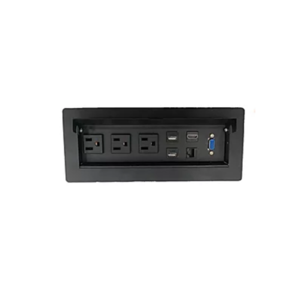 Multipuerto con 3 contactos eléctricos, 2 accesos USB para carga, acceso a línea de internet, HDMI y VGA.